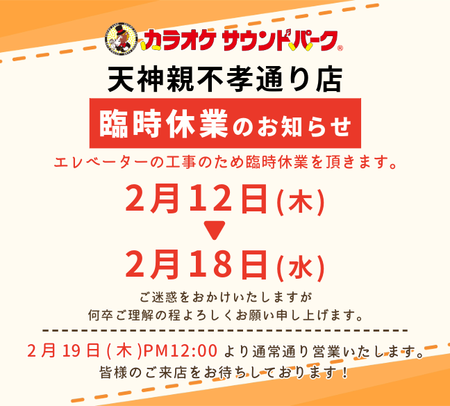 サウンドパーク天神親不孝通り店【臨時休業について】 ホーム 新着情報 お知らせ サウンドパーク天神親不孝通り店【臨時休業について】 お知らせ サウンドパーク天神親不孝通り店【臨時休業について】 一部店舗 2026.02.10