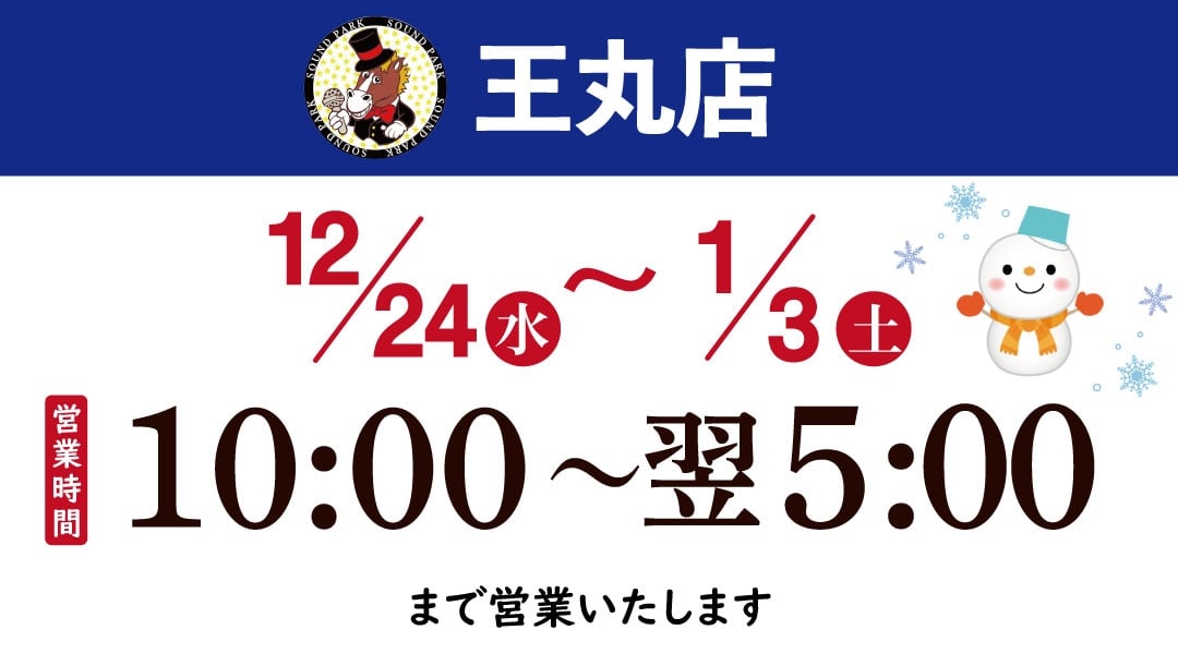 | 営業時間 | 日~木 10:00~翌2:00 金土祝前日 10:00~翌5:00 ※12/24(水)~1/3(土)10:00~翌5:00 年中無休 |